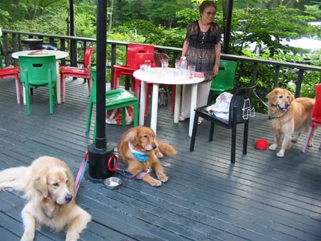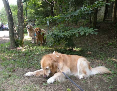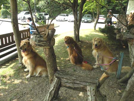 ソフトクリームの行列に並ぶ飼い主を待っている3ワン。