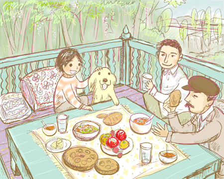 うわー!なんだかオイシそうなランチ!思い出すなあ、ウズベクで食べたボルシチとシシケバブ!カチカチのナンとサマルカンドのお塩!こんなチャイハネで食べたっけねえ。この絵は見てるだけでニコニコしちゃうよ!